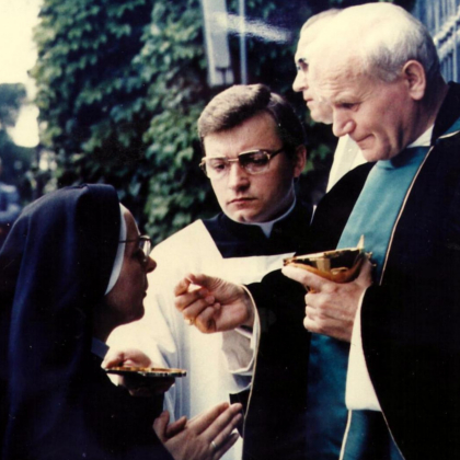 I zdarzył się cud! W wigilię Matki Bożej Częstochowskiej otrzymaliśmy informację, że Ojciec Święty zaprasza nas na ognisko do ogrodu w Castel Gandolfo! To było niewiarygodne: Ognisko z Papą! Po godzinie 21., 25.08.1985r. byliśmy na miejscu. Byłam tak bardzo szczęśliwa, że nie potrafię po ludzku wytłumaczyć, co wtedy działo się w moim dziecięcym sercu. Pamiętam, że do oczu cisnęły mi się łzy szczęścia… W pewnym stopniu uchwycił chyba to szczęście Arturo Mari na zdjęciu, na którym całuję Papę w rękę… Potem był wspólny śpiew, wspomnienia Papy, którymi się z nami podzielił. W pewnym momencie zaczął się rozglądać i zapytał: „A gdzie jest to maleństwo?” Chodziło o mnie, bo byłam najmłodsza w grupie. Papa posadził mnie przy sobie i co jakiś czas gładził po głowie. To spotkanie i dotknięcie jego ręki jest tak żywe we mnie, że myślę, że to szczególna łaska, że tak to wszystko pamiętam pomimo upływu lat…To pytanie: „Gdzie jest to maleństwo?” wraca do mnie w różnych momentach mojego życia… Bardzo mocno wybrzmiało, gdy rozeznawałam powołanie do życia zakonnego, a z perspektywy czasu odczytuję je, jako testament dla mnie pozostawiony przez Papę: mam być, jak dziecko przed Bogiem… Pan Jezus przecież powiedział: „Bądźcie jak dzieci. Kto nie stanie się, jak dziecko, nie wejdzie do Królestwa.” No więc ciągle się siebie pytam: „Gdzie jest dziecko we mnie? I czy jestem jak dziecko, jak to maleństwo?” Bo przecież tylko do takich należy Królestwo Niebieskie…