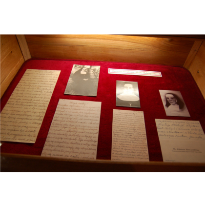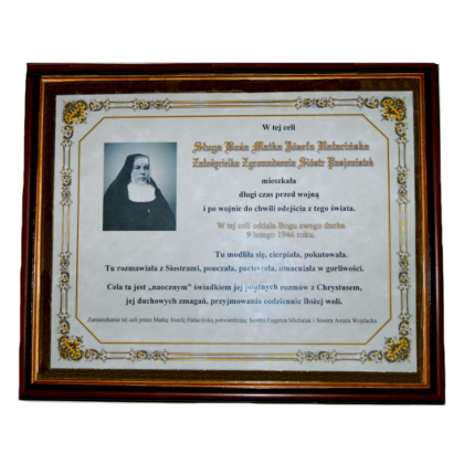 Muzeum znajduje się dokładnie w celi, w której zmarła 9 lutego 1946 r. Matka Józefa Hałacińska. To właśnie w tym miejscu Matka Założycielka modliła się, cierpiała, pokutowała. Tu rozmawiała z Siostrami, pouczała, pocieszała, umacniała w gorliwości. Cela ta jest „naocznym” świadkiem Jej poufnych rozmów z Chrystusem, Jej duchowych zmagań, przyjmowania codziennie woli Bożej. Gabloty zawierają własnoręcznie napisaną przez Matkę Założycielkę prośbę o pozwolenie na założenie Zgromadzenia, prośbę o zwolnienie ze ślubów w Zgromadzeniu Sióstr Serafitek, własnoręcznie pisane życzenia do Sióstr z okazji Świąt Bożego Narodzenia i Wielkanocy, książeczki Matki Założycielki z których korzystała podczas modlitwy.